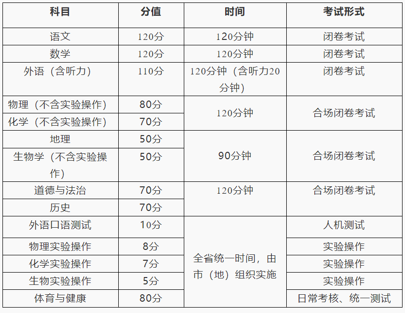 语文、数学、外语、道德与法治、历史、物理、化学、地理、生物学全省统一考试时间,外语口语、体育(统一测试环节)、理化生实验操作等考试在规定的时段内由各市(地)自行安排。“六三”学制和“五四”学制初中学生参加相关科目考试的具体时间由市(地)教育行政部门确定。
